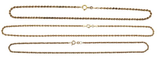 9ct gold twisted rope chain, stamped '375' and hallmarked; 9ct gold fancy twisted rope chain, stamped '375' with import marks and 9ct gold twisted rope chain, stamped '375' (3)