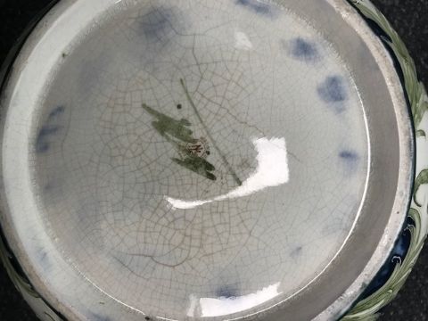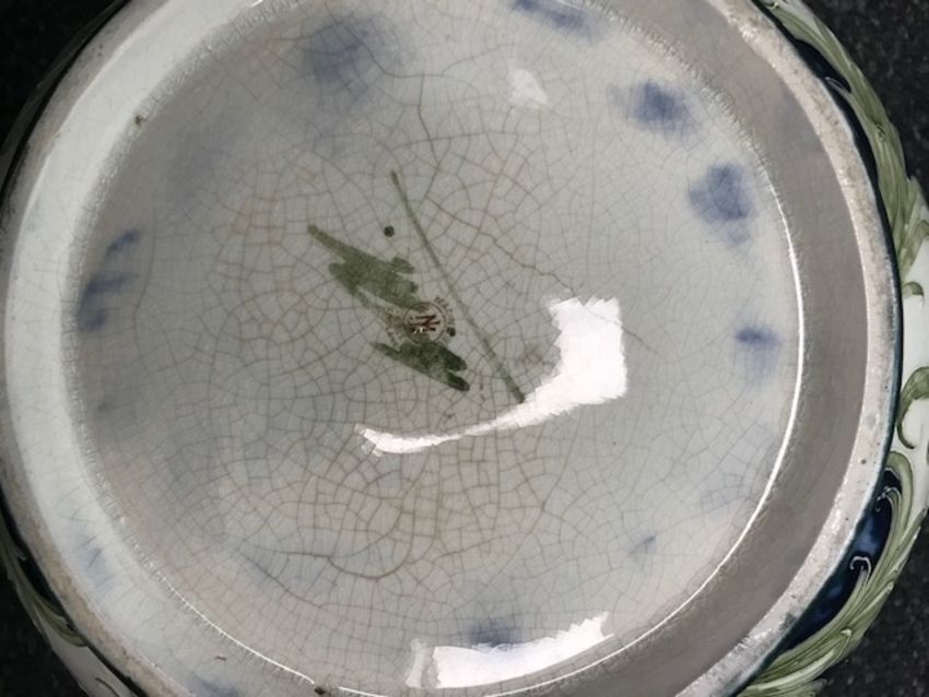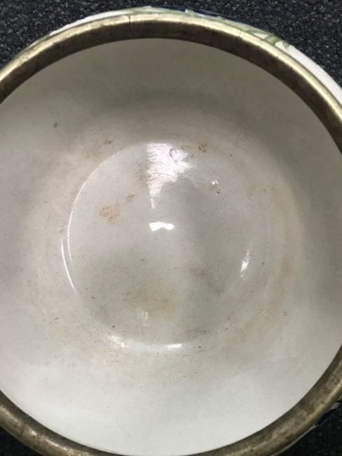 Condition: Some fine cracks to the silver plate rim which is marked and worn. The interior marked due to use, see image. The underside of the base is crazed and there is some crazing to areas of the white ground near the rim.