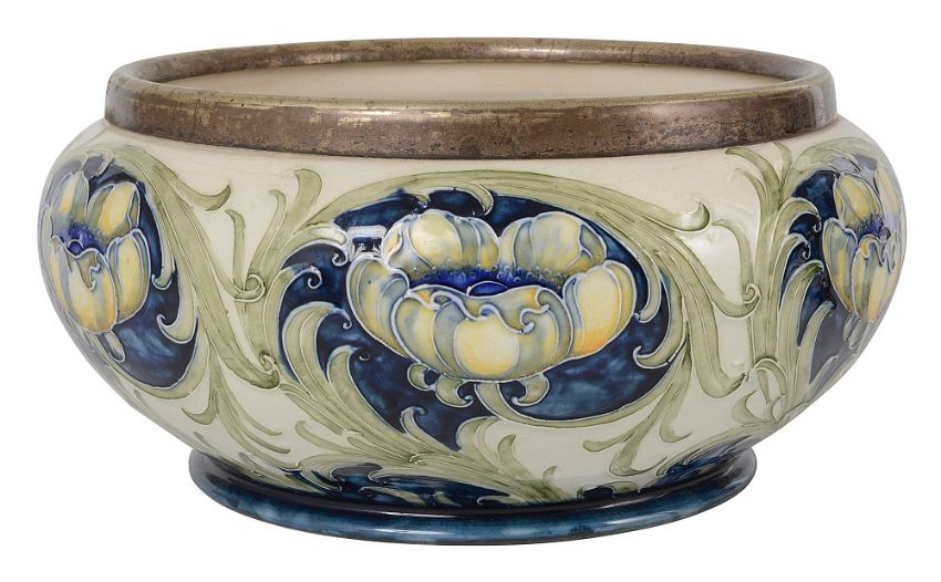 tube lined, with a silver plated rim and of squat bulbous form, underside printed marked 'JMc Macintyre Burslem England in brown and WM initials in green