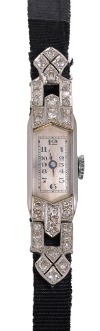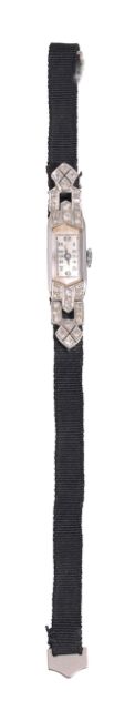 An Art Deco lady's diamond-set cocktail watch the silvered shaped rectangular dial with Arabic numerals and brilliant- and single-cut diamond-set detail to the articulated lugs set with single-cut diamonds and black moiré strap bracelet with clasp stamped '9CT', 12.2gCondition: Overall condition fair to good : dial slightly discoloured and moiré strap worn.Ticks as of 29/9/23. Movement not inspected or guaranteed