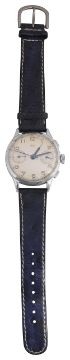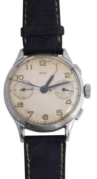 circular silvered dial with luminous Arabic numerals, minute scale, subsidiary seconds dial and 45 minute chronograph, blue steel and tritum hands, Signed ARSA for Auguste Reymond SA, manual wind Landeron 52, 17 jewels movement, leather strap bracelet