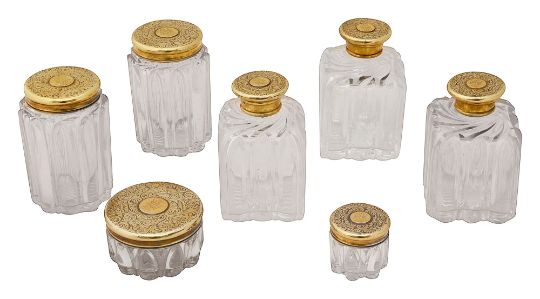 Seven early Victorian silver-gilt mounted cut glass toilet bottles and jars