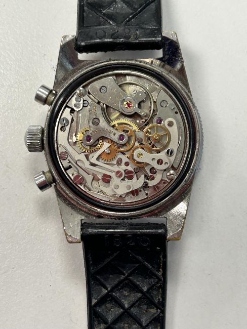 circular black dial with luminous hour baton markers, telemeter scale, subsidiary seconds dial at 9 and 30 minute chronograph with flyback hand at 3, silver baton hands and centre sweep 'flyback' seconds hand, sigedn Oriosa swiss 20 ATM Incabloc 17 Jewels, manual wind Landeron 17 jewel cal 284 movement, bi-rotating bezel, chromed case, associated rubber strap in an Oriosa box with a guarantee dated 1967
