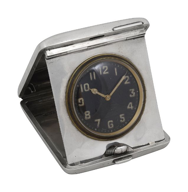 London, circa 1919, Reichenberg & Co., of folding cased form, the 5.5inch dial marked '8 Day Swiss Made, movement impressed "Brevet 33236' rear of watch case, 'Swiss Made 1284670'
