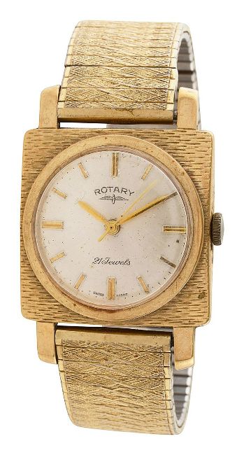 A vintage 9ct gold Rotary manual wind wristwatchthe silvered dial with baton numerals and textured square case, 21 jewel movement, on gilt metal expandable strap, the case numbered 922127diameter of dial width 2.8cmCondition: Some general wear. Does not wind tick or run. Gross weight including expandable plated bracelet approx. 43.8g