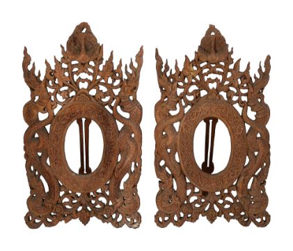 oval apertures with scroll carved borders, with pierced and carved openwork surround framed by a pair of dragons and surmounted by a peacock finial, (2)