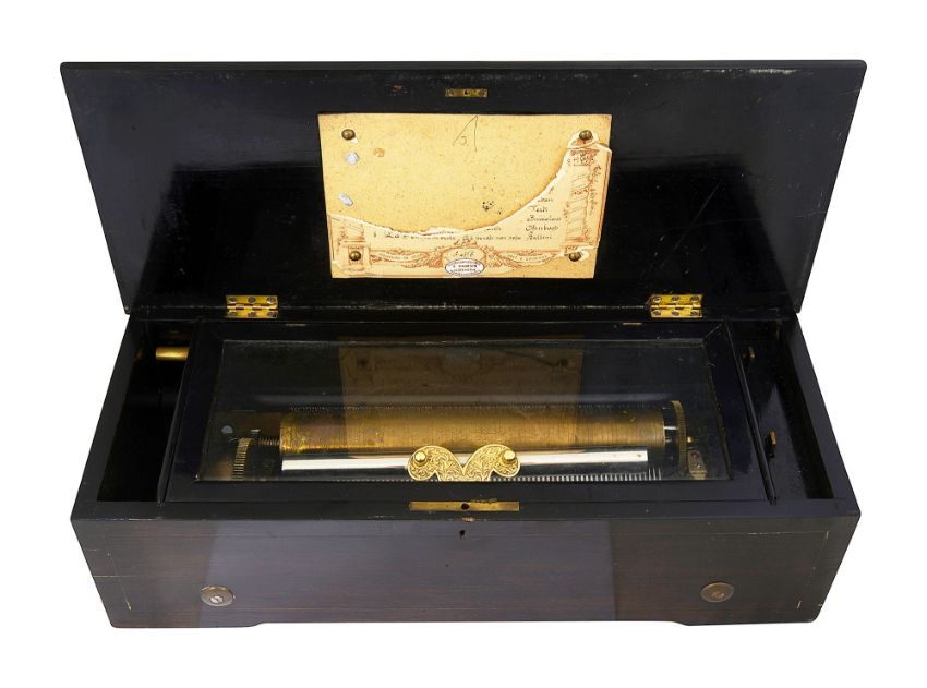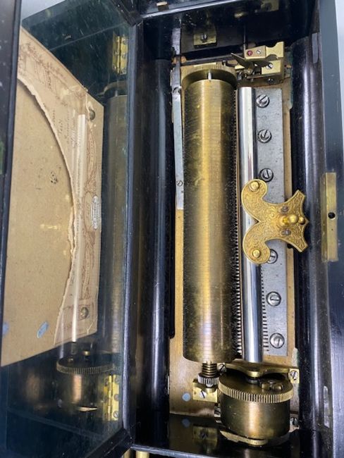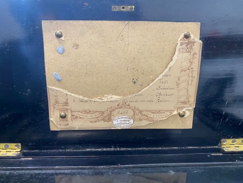 the 28cm brass cylinder playing eight airs as listed on the tune sheet, bearing retailer's label, 'F Thomsen Kjobenhaven Store Kongensgade No21 Musikvarelaget', with zither attachment, lid inlaid with stringing and a gryphon
