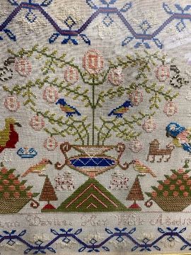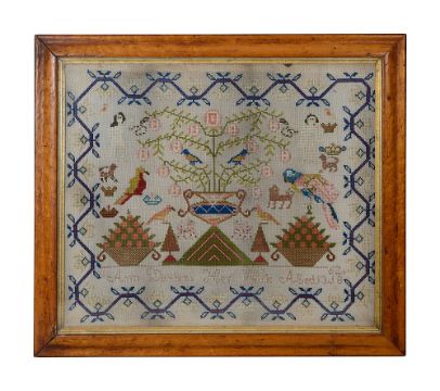 the central flowering urn enclosed by parrots, crowns, lions, two fruit baskets, two figures and trees, signed 'Ann Davies. Her Work Aged 13 1862' within a red and blue trailing border, maple framed with gilt slip