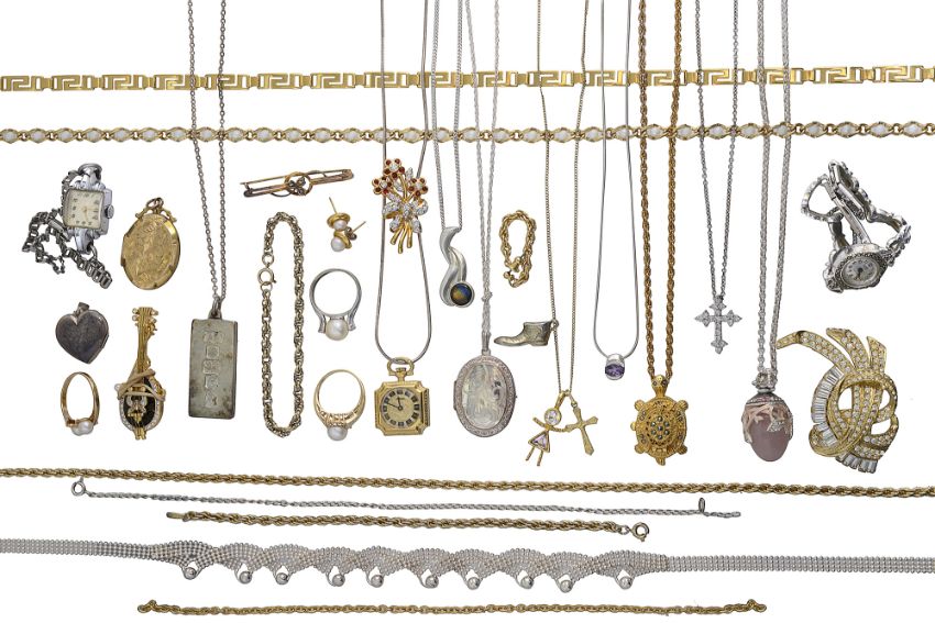 total approx weight of 9ct 4.6g, total approx weight of ingot 1.00ozt, total approx weight of silver chain 0.27ozt
