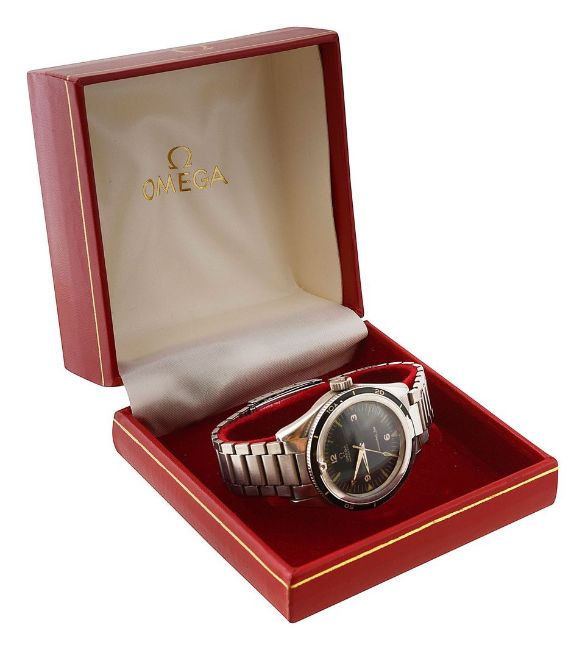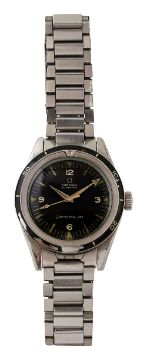 black dial with luminous dart markers and Arabic quarters, polished broad arrow hands with luminous inserts and centre seconds, 24 jewels cal 552 automatic movement, numbered 19364421, brushed polished tonneau shaped case with, bi-directional rotating military style bezel with black calibrated insert, screw down back stamped Omega watch Co., stainless steel bracelet with foldover clasp numbered 7912