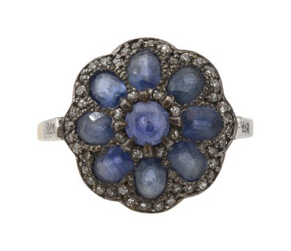A sapphire and diamond-set cluster ringof octafoil slightly bombé design, set with nine oval mixed-cut sapphires with single-cut diamond-set border, three stone diamond-set shoulder to the shank stamped '18CT PLAT'ring size O, 3.6gCondition: Overall condition good/very good.Sapphire colour well matched , some with windows