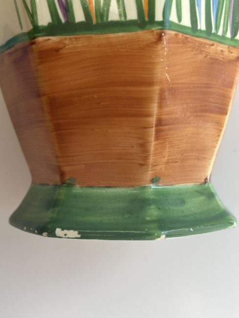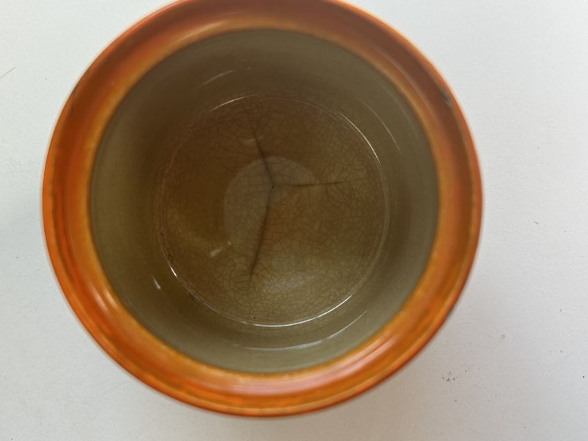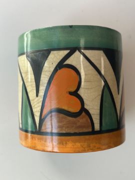first drum shape, painted with a stylised leaf and geometric design in orange, black, brown and green, printed Bizarre mark, second of octagonal form, printed marks, (2)