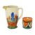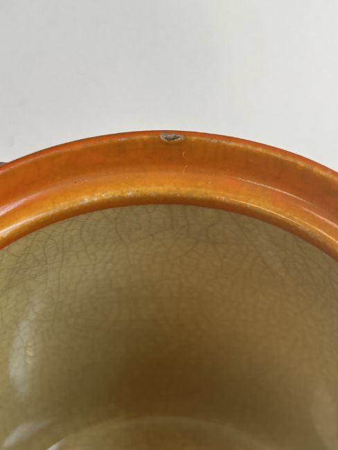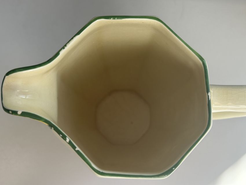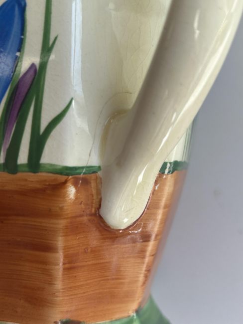 Condition: Preserve pot with crazing with staining to exterior. Star crack to base. Small nick to rim. Crocus jug with chips to green on rim and footrim . crack around lower handle joint. Crazing