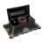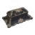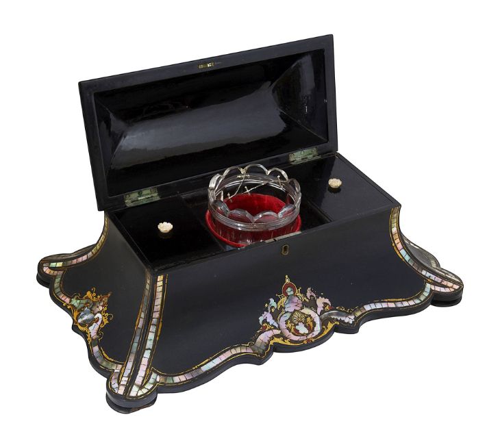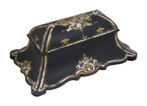 An early Victorian papier mache tea caddyof rectangular form with swept sides, shaped outline and hinged domed lid, inlaid with other of pearl and with gilt scrolls, fitted interior with twin lidded compartments and central well with cut glass mixing bowl, bears label Manchester: Charles Henry, Civet Cat, 18, Market Street height 17.5cm., length 43cm., depth 26cm.Condition: Some rubbing to gilt. No losses or cracks. Mixing bowl with old riveted repair. No key.