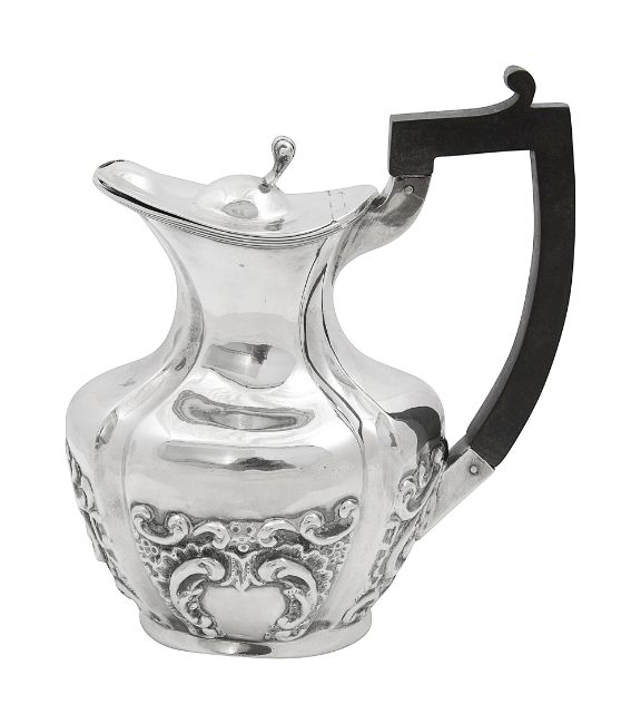 of shaped oblong baluster form half embossed with rocaille scroll design , having hinged cover with scroll thumbpiece and ebonised scroll handle