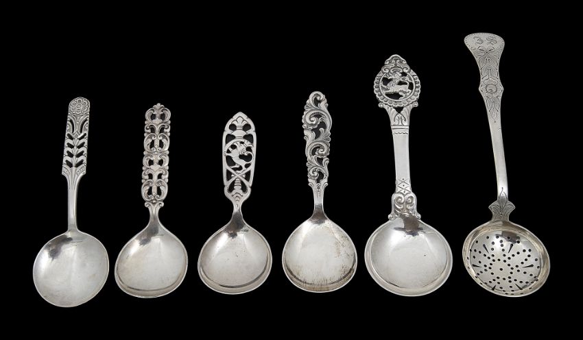 to include a David Anderson floriform pattern caddy spoon, a Tele pattern caddy spoon by Brodrene Mylius, two caddy spoons by Magnus Aase with pierced handles of which one foliate scroll design the other with a rampant lion, a long handled spoon, the terminal with rampant lion terminal by Brodrene Lohne, and a sifter spoon with foliate engraved handle, initialled (6)