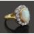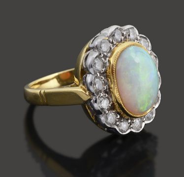 An opal and diamond-set cluster ringthe central oval cabochon opal measuring 10.6mm x 8.1mm x 4.7mm collet-set above the surround of fourteen brilliant-cut diamonds to the 18ct hallmarked shankring size K, 8.2gCondition: Overall condition very goodOpal (open backed) with good play of colours including reds particularly to one sideDiamonds: bright with an estimated total weight of +/- 1ct