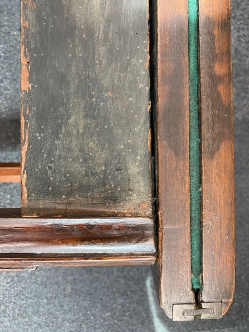 Condition: The top has an old repaired split due to carcass wood shrinkage. There is a repair to a break to one rear leg.