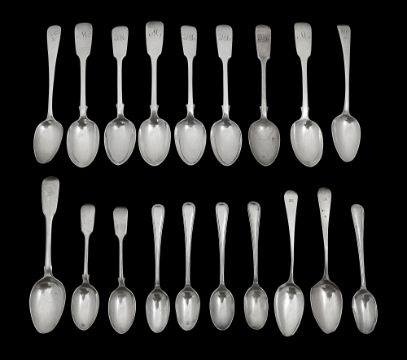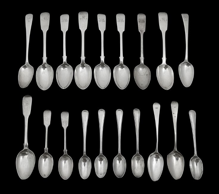 London, 1850, Robert Wallis, three with maker's stamp for SS, and one 1817, each of the three groups with differing monograms, also two late George III teaspoons, monogrammed, two smaller examples, two small Victorian examples, Sheffield, and five George V teaspoons, Sheffield, 1918, (19)