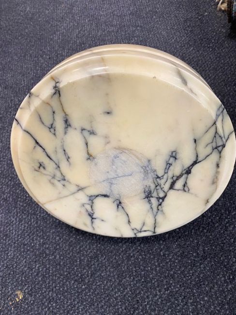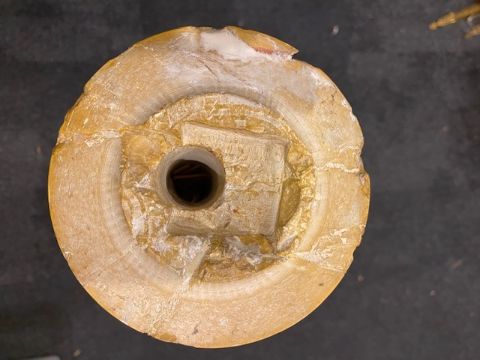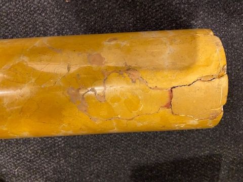 Condition: Good overall for its age. There is a mark to its top, see image. There are cracked areas and a restored area to the top of the column. Tops and bases with small chips to their edges.