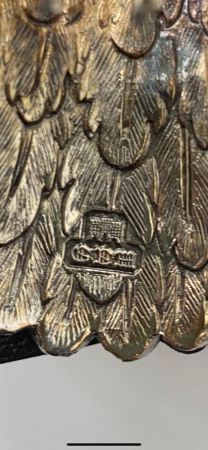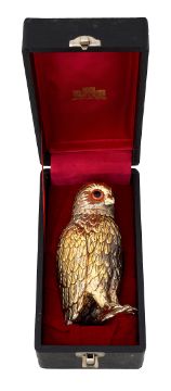 gilt finished, the removable head with glass eyes, tail bearing marks incorporating a castle, with original box