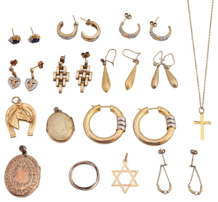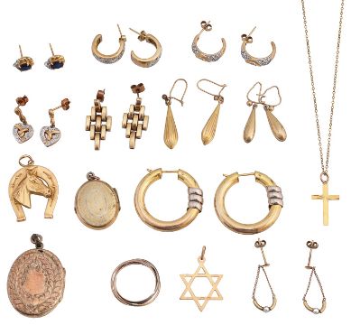 a horse and horse shoe pendant, stamped '750'; a pair of large hoop earrings, stamped to stem '375' with import marks; two pairs of 9ct gold and diamond chip earrings, both variously stamped '375'; a pair of 9ct gold ear-pendants, stamped '375' with import marks; a pair of 9ct gold and diamond chip heart shaped ear-pendants, stamped '375'; 9ct gold three band ring, stamped '375' with hallmarks; two pairs of 9ct gold ear-pendants, both variously stamped '375'; a pair of ear-pendants, stamped '9ct'; a pair of continental 14k gold and blue-gem set ear-studs, stamped '585'; a 9ct gold star of David pendant, stamped '375' and a 9ct gold crucifix, stamped '9.375' and two lockets, unmarked (qty)