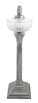 cut clear glass reservoir supported on a stop fluted column and raised on a weighted square stepped base with gadrooned borders, converted for electricity