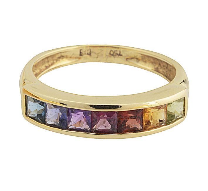 square cut, channel set multi-gem ring, stamped "750 HS"