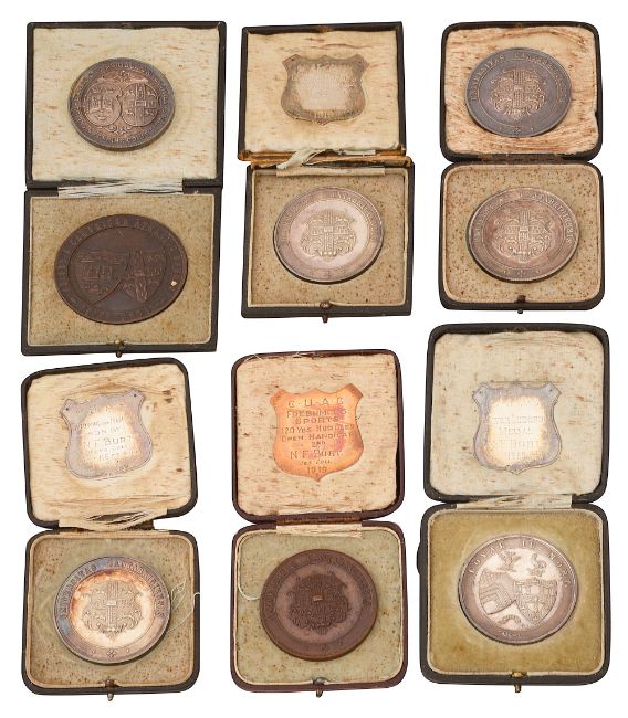 A collection of Cambridge University silver and bronze sporting prize medals awarded N.F Burt Jesus College