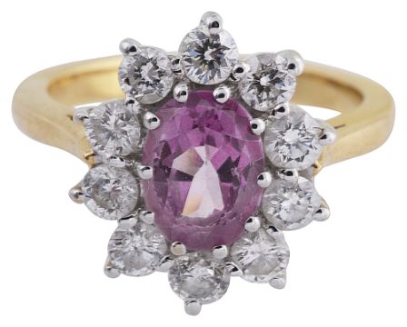 A pink topaz and diamond-set cluster ringthe oval mixed-cut pink topaz measuring 8.1mm x 6.0mm x 4.5mm to the ten brilliant-cut diamonds to the 18ct plain tapering shankring size M, 5.7gCondition: Overall condition good/very goodDiamonds: total estimated weight 1.00ct, bright stones, some with small inclusions