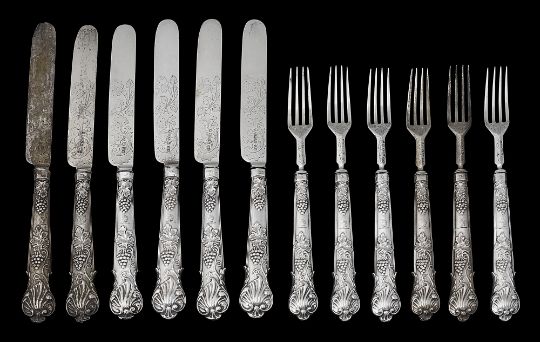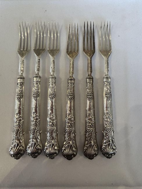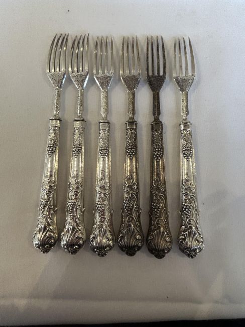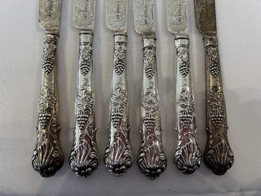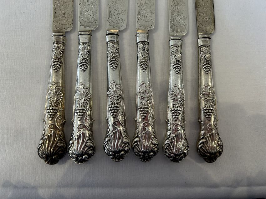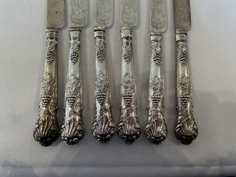 A set of twelve Victorian silver dessert forks and knivesSheffield, 1865, William Sansom, with shell and berry embossed filled handles and foliate scroll etched blades and prongs, (12)weight overall approx 18.9oztCondition: One knife blade and handle now detached.One knife blade and handle now detached. No splits or repairs. Terminal of one knife handle bumped