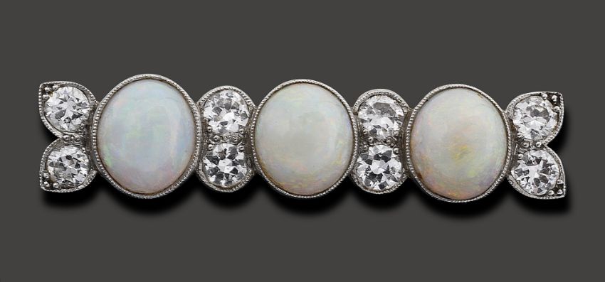 the bar collet-set with three oval opal cabochons separated by pair of brilliant-cut diamonds, fitted case