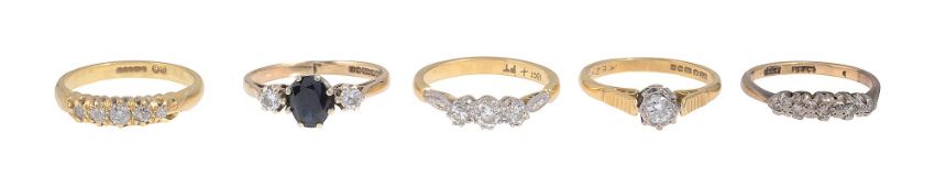 a single stone diamond ring, round brilliant cut diamond set in 18ct gold band, stamped with Birmingham hallmarks; three stone diamond ring, three round brilliant cut diamonds, coronet set to a plain shank, stamped '18ct + PT'; a five stone diamond ring, a tapering line of graduated mixed cut diamonds, set to a plain shank, stamped with Birmingham hallmarks; a sapphire and diamond three stone ring, centrally set oval cut sapphire between two round brilliant cut diamonds, coronet set to a plain tapering shank and a graduated five stone diamond ring, stamped '18 PLAT' (5)