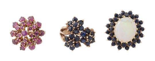 stamped '18k' together with an opal and sapphire 9ct gold clustering, stamped '9.375' with hallmarks and a sapphire floral cluster ring, stamped '9.375' with hallmarks (3)