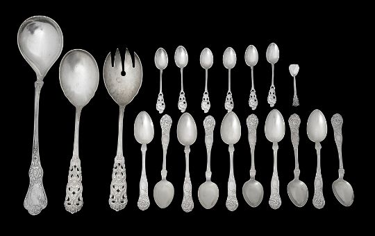 comprising a set of ten teaspoons by David Andersen c.1915 the handles with acanthus scroll decoration, initialled and dated, a set of six coffee spoons with squirrel terminals, initialled, a pair of salad servers with pierced foliate scroll handles engraved Joan, a serving spoon engraved Valerie and a salt spoon, (qty)