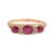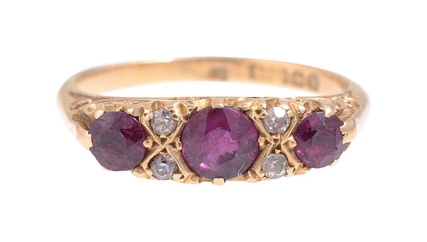 An early 20th century ruby and diamond-set ringthe three graduated circular mixed-cut rubies with diamond single cuts between, to the 18ct yellow gold scrolling gallery and plain shank, Birmingham hallmark,ring size L, 3.5gCondition: Overall condition good, commensurate with age Rubies well matched, rich red with very slight blue undertones A couple of few claws possibly retipped..