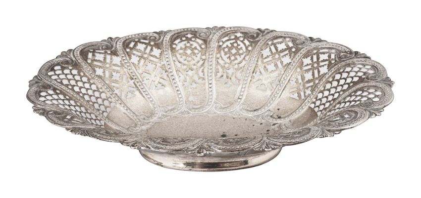 oval form with pierced decoration and embossed with beaded S- scrolls, raised on an oval foot
