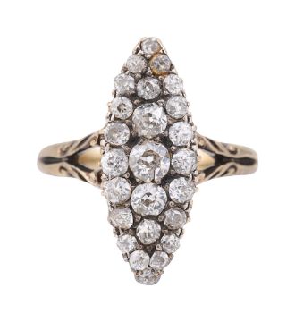 A late Victorian diamond-set ringthe navette-shaped panel set with old brilliant-cut and old-cut diamonds the to the bifurcated scrolling and plain shank stamped '18' diamonds ring size L1/2, plaque length 2.0cm, width 0.8cm, 3.6gCondition: Overall condition good/very good commensurate with age.Diamonds bright, some slightly off cut with a couple of end stones possibly replacements. .
