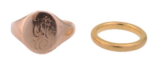 stamped '22' with Birmingham hallmarks together with a 9ct gold signet ring, stamped '9.375' with Birmingham hallmarks, chased with initials (2)