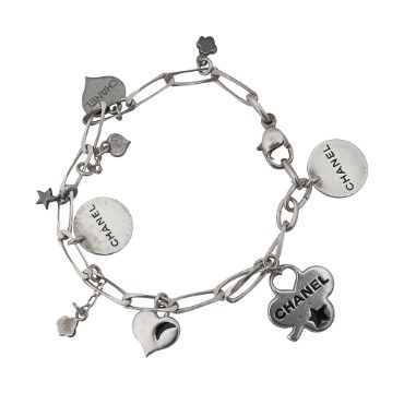 stamped to clasp '925', suspending a variety of charms including a clover, a heart, a star and a disc inscribed 'Chanel' all variously stamped '925' with hallmarks