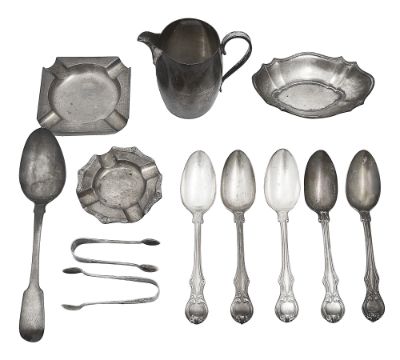 first London, 1938, Charles packet and Co Ltd, of plain barrel form with reeded loop handle, together with five early Victorian Victoria pattern dessert spoons, London, 1839/1844, Samuel Hayne & Dudley Carter, a George V pin dish, and engine turned ashtray, another ashtray, two sugar tongs and a fiddle pattern tablespoon, (qty)