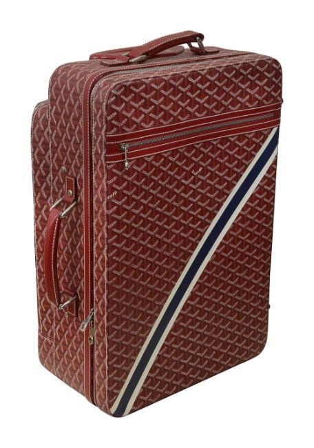 A red trolley rolling suitcase by Goyard
