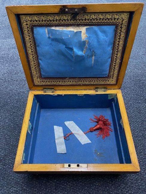 Condition: The interior formerly with a tray. The fabric to the padded section distressed. Otherwise in good condition overall. Key present.