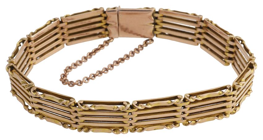 the five bar bracelet marked on the fastening 15ct, with safety chain