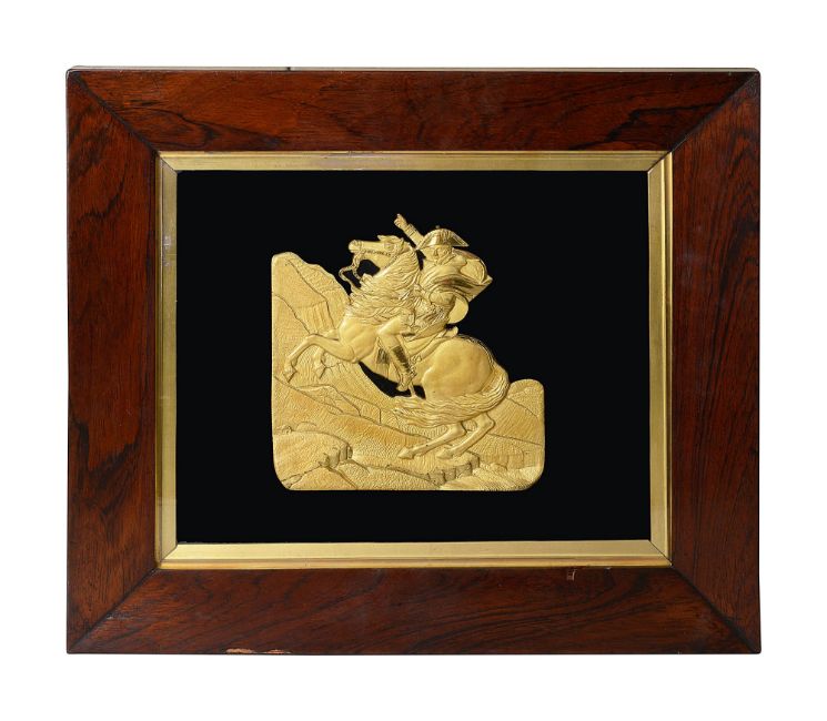 mounted on horse back after the David, 'Napoleon Crossing the Alps', mounted against black corded velvet, rosewood frame with gilt slip