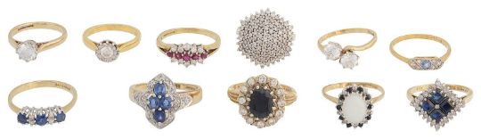 a brilliant-cut diamond single stone to the hallmarked 18ct gold setting; together with seven hallmarked 9ct gold rings: three sapphire and diamond; a ruby and diamond; an opal, diamond and sapphire cluster; a single-cut diamond-set hexagonal slightly bombé cluster; sapphire and diamond ring, set to a plain shank, stamped "18ct PLAT"; sapphire and diamond four stone ring, set to a plain 9ct gold shank, stamped with hallmarks and a CZ two stone (11)