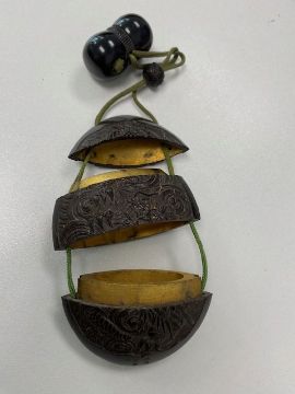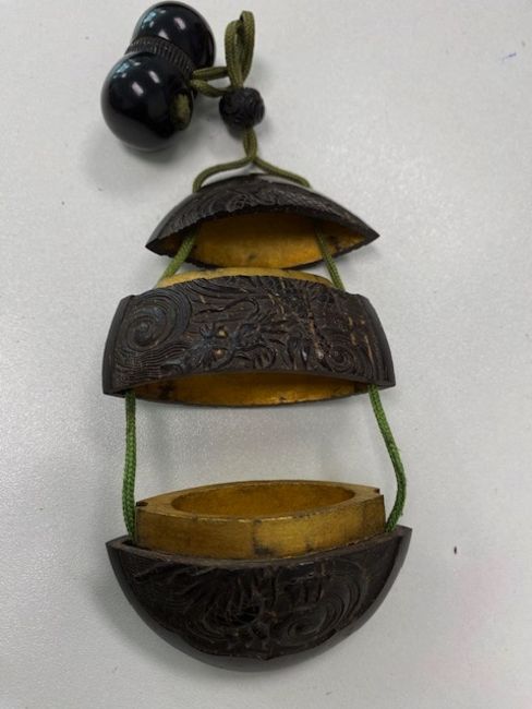 first in the form of a crab climbing in a bamboo frame, together with a silver miniature birdcage, a carved wood okimono of the three wise monkeys with inlaid eyes raised on an associated bronze stand, together with a Chinese miniature filigree sedan chair, (4)