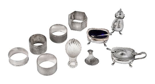 An Elizabeth II silver three piece cruet set, two caddy spoons and assorted napkin rings