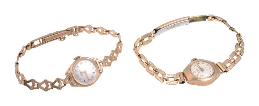 Two ladies 9ct gold bracelet wristwatchesthe first Rotary watch with silvered dial and Arabic and baton numerals and with fancy link bracelet, the second Perona with silvered dial and Arabic numerals, with fancy link bracelet unmarked with stainless steel buckle (2)weight approx 24.6gCondition: Movements not tested or guaranteed. Second bracelet not marked or tested.Movements not tested or guaranteed. Second bracelet not marked or tested. Rotary does not wind tick or run. bracelet hallmarked, Gross weight approx. 12g.