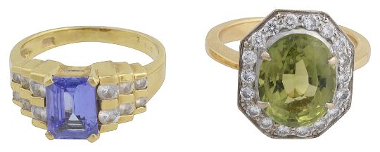 the first set with a central oval-cut peridot to the 18 brilliant-cut diamond-set octagonal border, to a plain 18ct hallmarked shank; the second set with a central step-cut tanzanite to the tiered shoulders set with twelve brilliant-cut diamonds, to a plain shank stamped '18K', (2)